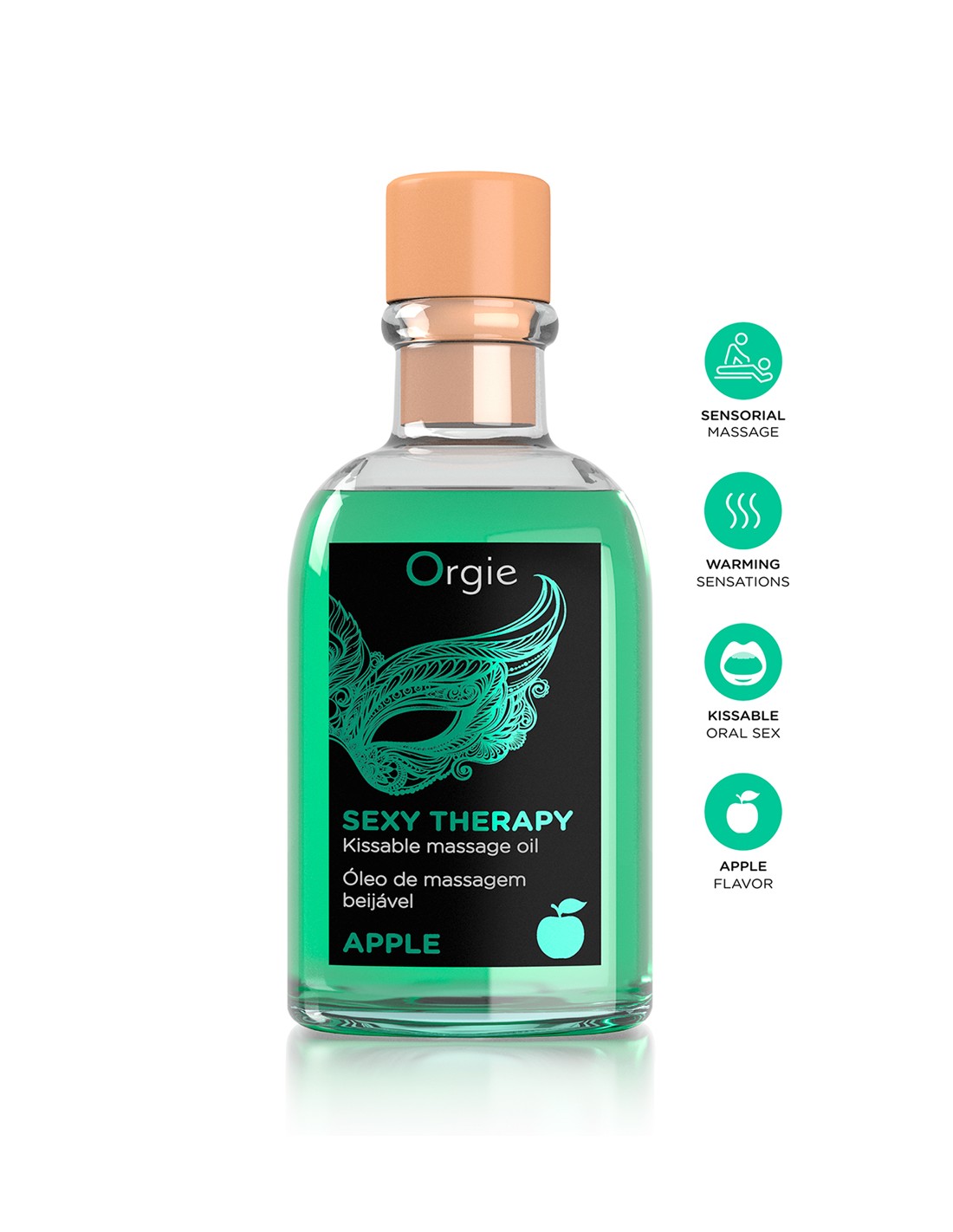 Sexy Therapy Apple, une huile de massage embrassable parfumée à la pomme, accompagnée d'une plume pour booster les sensations.